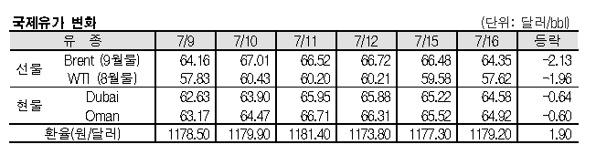 7월16일 국제유가는 미국-이란 간 긴장감이 완화될 것이라는 기대가 확산되면서 하락했다. 표, 그래프: <국제유가 변화> |