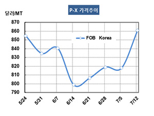 P-X 시세는 7월12일 FOB Korea 톤당 861달러로 43달러 폭등했고 CFR SE Asis는 870달러로 45달러 폭등했다. CFR China 역시 880달러로 43달러 급등했다.