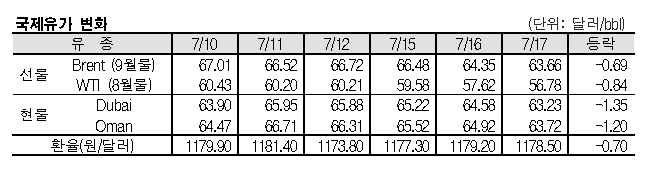 7월17일 국제유가는 미국의 석유제품 재고 증가, 미국 멕시코만의 원유 생산활동 재개 소식 등의 영향으로 하락했다.