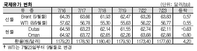 7월23일 국제유가는 중동지역의 긴장감 지속, 미국의 원유 재고 감소 추정 등의 영향으로 상승했다.