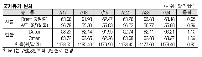 7월24일 국제유가는 사우디와 쿠웨이트 국경지대의 원유 생산활동 재개 가능성, 미국의 주요 경제지표 악화, 미국 달러화 가치 상승 등의 영향으로 하락했다.