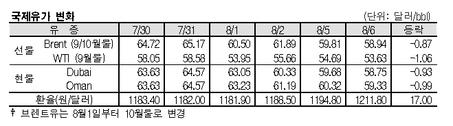 8월6일 국제유가는 미국-중국의 무역갈등 심화, 미국 달러화 강세 등의 영향으로 하락했다. 8월6일 국제유가는 미국-중국 무역갈등이 심화된 영향으로 하락했다. 표, 그래프: <국제유가 변화> <화학저널 2019/08/07> |