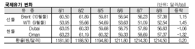 8월8일 국제유가는 OPEC(석유수출국기구)의 추가 감산 가능성 제기, 사우디의 원유 수출량 감축계획 발표, 호르무즈 해협 긴장 지속 등의 영향으로 상승했다.