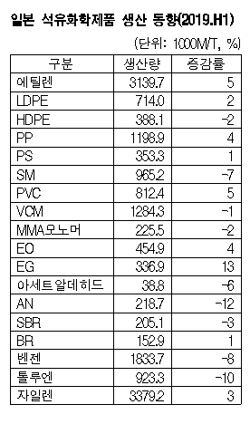 일본 석유화학협회가 발표한 2019년 6월 석유화학제품 생산실적에 따르면, LDPE와 PP(Polypropylene)는 정기보수 설비가 줄어들어 생산량이 증가했다.