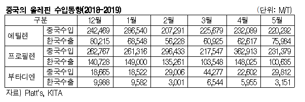 에틸렌(Ethylene)은 중국 수출이 4개월만에 월간 7만톤 수준을 회복했다. 프로필렌(Propylene)은 중국 수출이 5만톤 가까이 격감했다. 표, 그래프: <중국의 올레핀 수입동향(2018-2019)> <화학저널 2019/08/13> |