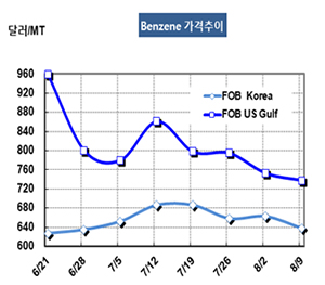 표, 그래프: <Benzene 가격추이> <화학저널 2019/08/14> |