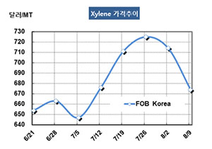 표, 그래프: <Xylene 가격추이> <화학저널 2019/08/16> |