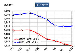 HIPS, CFR SEA 1160달러로 30달러 떨어져 … 위안화 약세 위력적