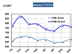 표, 그래프: <Benzene 가격추이> <화학저널 2019/08/28> |