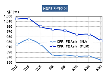 HDPE(High-Density Polyethylene)는 전 그레이드에 걸쳐 하락했다.