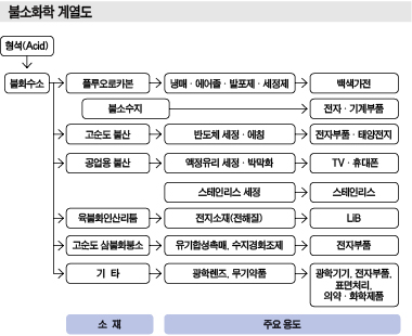 형석으로부터 생산한 불화수소산(불산)을 원료로 사용하는 불소 화학제품은 에어컨 냉매 등으로 투입되는 플루오로카본(Fluorocarbon)을 비롯해 내열성·내약품성 등이 우수한 불소수지(Fluororesin), 반도체 제조공정에 필수적인 고순도 불산 등이 있다.