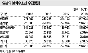 일본은 2018년 불산 생산량이 26만7974톤으로 전년대비 2.3%, 출하량이 26만8651톤으로 1.6% 감소했다.