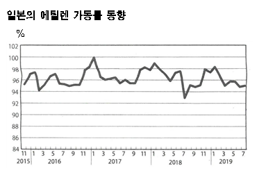 일본은 에틸렌(Ethylene) 풀가동 체제를 12개월 유지하고 있다. 표, 그래프: <일본의 에틸렌 가동률 동향> <화학저널 2019/09/09> |