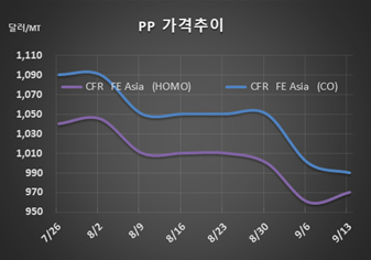 PP 시세는 9월11일 라피아(Raffia) 그레이드가 CFR FE Asia 톤당 970달러로 10달러 상승했으나 CFR SE Asia는 1000달러로 5달러 하락했다. IPP Film은 FEA가 990달러를 유지한 반면 SEA는 1020달러로 5달러 떨어졌고, BOPP는 FEA가 980달러를 유지했으나 SEA는 1025달러로 10달러 하락했다.