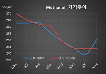표, 그래프: <Methanol 가격추이> <화학저널 2019/09/17> |