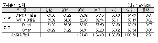 9월19일 국제유가는 중동지역의 지정학적 리스크가 계속된 영향으로 상승했다.
