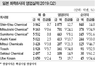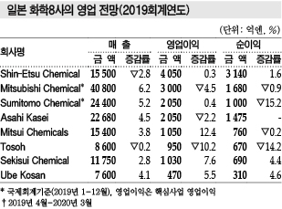 일본 화학 메이저 8사는 2019년 2분기에 매출 증가가 3사에 그쳤고 영업이익은 5사가 감소한 것으로 나타났다. 2019년 전체적으로는 8사 모두 수익성이 악화될 것으로 예상하고 있다.