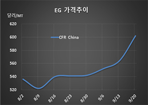 MEG 시세는 9월20일 CFR China 톤당 602달러로 38달러 폭등했고 CFR SE Asia도 607달러로 38달러 폭등했다.