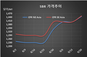 SBR(Styrene Butadiene Rubber)은 의외로 강세를 계속하고 있다. SBR 시세는 9월19일 CFR NE Asia 톤당 1450달러로 50달러 급등했고 CFR SE Asia도 1450달러로 50달러 급등했다. 표, 그래프: <SBR 가격추이> <화학저널 2019/09/27> |