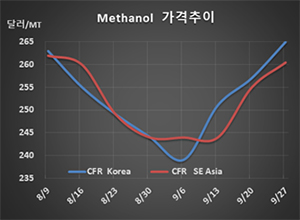 표, 그래프: <Methanol 가격추이> <화학저널 2019/10/01> |