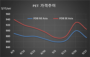 Bottle 그레이드 PET 시세는 9월26일 FOB NE Asia 톤당 875달러로 25달러 하락했고 FOB SE Asia도 905달러로 25달러 떨어졌다.