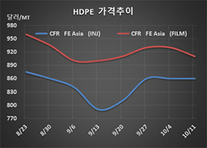 표, 그래프: <HDPE 가격추이> <화학저널 2019/10/14> |