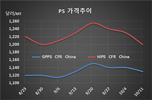 GPPS(General Purpose PS) 시세는 10월9일 CFR China 톤당 1130달러로 10달러 하락했고 CFR SE Asia는 1140달러로 20달러 떨어졌다.