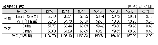 10월17일 국제유가는 미국의 석유제품 재고 감소, 노딜 브렉시트(No-Deal Brexit) 우려 완화, 미국 달러화 약세 등의 영향으로 상승했다. 10월17일 국제유가는 미국의 석유제품 재고가 감소한 영향으로 상승했다. 표, 그래프: <국제유가 변화> <화학저널 2019/10/18> |