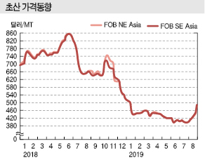 한편, 초산 시세는 8월 말 CFR FE Asia 톤당 480달러로 상승한 후 고공행진을 이어가고 있다. 다만, FOB China는 450달러로 상대적으로 약세를 나타내고 있다.