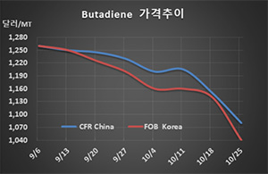 부타디엔 시세는 10월25일 FOB Korea 톤당 1040달러로 100달러 폭락했고 CFR SE Asia 역시 1050달러로 100달러 폭락했다. CFR China는 1080달러로 70달러 떨어지는데 그쳤으나 CFR Taiwan은 1050달러로 10달러 폭락했다.