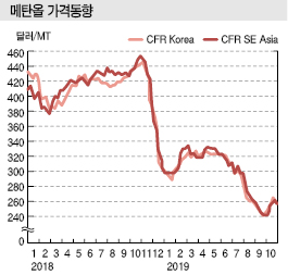 메탄올(Methanol)은 국내 수입가격이 지나치게 높아 문제가 되고 있다. 표, 그래프: <메탄올 가격동향> <화학저널 2019년 11월 4일> |