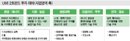 2호펀드는 1호펀드가 중점적으로 다루었던 생명과학, 모빌리티·우주, 전자·정보 분야에도 주목하지만 ESG(환경·사회·거버넌스) 투자와 SDGs(지속가능한 개발목표) 실천 등을 바탕으로 이산화탄소 감축 등 지구환경 문제나 국제사회가 겪고 있는 과제를 해결할 수 있는 혁신기술을 갖춘 벤처 등에게 투자를 집중할 예정이다.