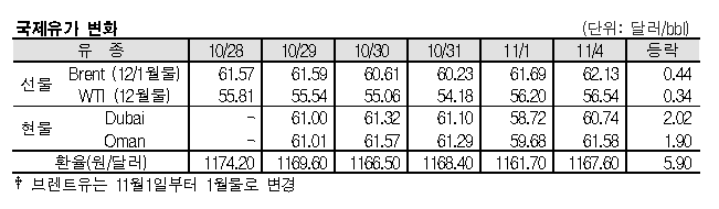11월4일 국제유가는 미국-중국의 1단계 무역합의 서명에 대한 기대감, 미국기업들의 3분기 영업실적 호조 등의 영향으로 상승했다. 11월4일 국제유가는 미국-중국 1단계 무역합의 서명에 대한 기대감이 확산된 영향으로 상승했다. 표, 그래프: <국제유가 변화> <화학저널 2019/11/05> |
