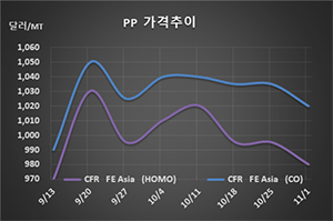 표, 그래프: <PP 가격추이> <화학저널 2019/11/05> |