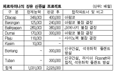 인도네시아 페르타미나(Pertamina)가 정유공장의 고도화 투자를 연기했다. 표, 그래프: <페르타미나의 정유 신증설 프로젝트> <화학저널 2019/11/08> |