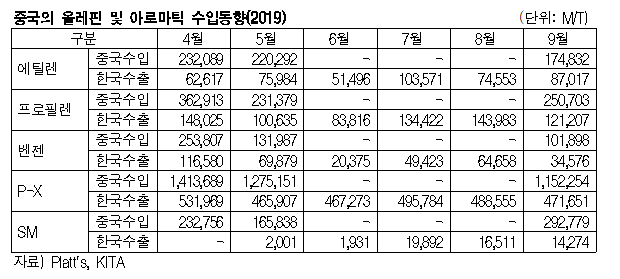 에틸렌(Ethylene)은 중국 수출이 증가세를 되찾았다. 반면, 아로마틱(Aromatics)은 중국 수출이 감소하고 있다. 표, 그래프: <중국의 올레핀 및 아로마틱 수입동향(2019)> <화학저널 2019/11/11> |