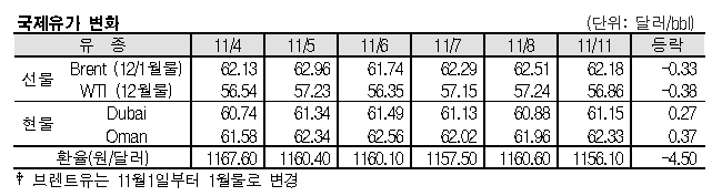 11월11일 국제유가는 미국-중국 무역협상에 대한 우려, 사우디의 10월 원유 생산량 증가 추정, OPEC(석유수출국기구)+의 추가 감산에 대한 불확실성 지속, 중국 경제지표 부진 등의 영향으로 하락했다. 11월11일 국제유가는 미국-중국 무역협상에 대한 우려가 확산되면서 하락했다. 표, 그래프: <국제유가 변화> <화학저널 2019/11/12> |