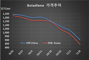 표, 그래프: <Butadiene 가격추이> <화학저널 2019/11/12> |