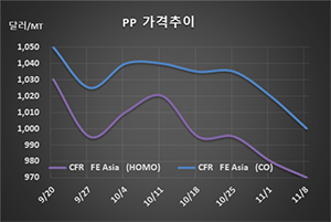 표, 그래프: <PP 가격추이> <화학저널 2019/11/12> |