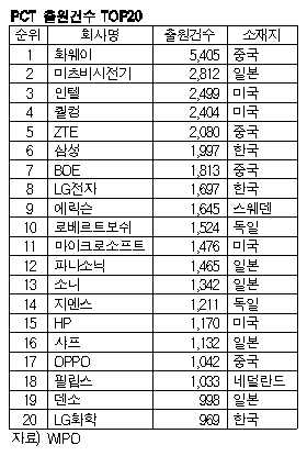 중국의 특허 출원건수가 계속 증가하고 있다. 표, 그래프: <PCT 출원건수 TOP20> <화학저널 2019/11/15> |