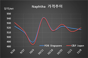 나프타 시세는 11월8일 C&F Japan 톤당 520달러로 8달러 상승했으나 FOB Singapore은 516달러로 3달러 하락했다. 11월1일 역전된데 따른 반동으로 상승이 엇갈린 것으로 판단된다.