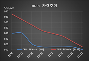 표, 그래프: <HDPE 가격추이> <화학저널 2019/11/25> |