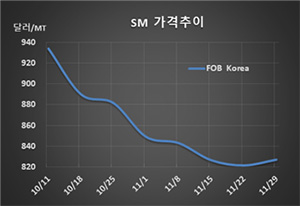 SM 시세는 11월28일 FOB Korea 톤당 827달러로 5달러 상승했고 CFR SE Asia도 847달러로 6달러 올랐다. CFR India 역시 842달러로 6달러 상승했다.