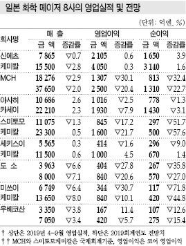 2019회계연도(2019년 4월-2020년 3월) 기준 상반기에 해당하는 4-9월 영업이익이 증가한 화학기업은 8사 중 2사에 불과한 것으로 파악되고 있다.