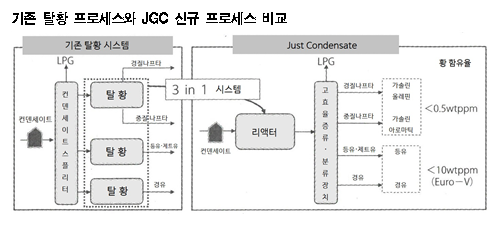 JGC가 컨덴세이트(Condensate) 일괄 탈황 프로세스를 개발했다. 표, 그래프: <기존 탈황 프로세스와 JGC 신규 프로세스 비교> <화학저널 2019/12/12> |