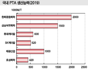그러나 국내 PTA 생산능력은 한화종합화학 200만톤을 비롯해 삼남석유화학 150만톤, 태광산업 100만톤, 롯데케미칼 60만톤, 효성화학 42만톤으로 가동을 중단한 SK케미칼 52만톤을 포함해도 604만톤에 불과해 중국 메이저 1사의 생산능력에 불과할 정도로 규모화하지 못했다.