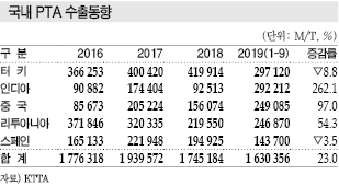 2018년 PTA 수출은 터키가 41만9914톤으로 40% 수준에 도달한 가운데 리투아니아, 스페인에 20만톤 안팎을, 중국에는 15만6074톤을 수출했고, 2019년 들어서는 1-9월 터키와 인디아에 29만톤 이상을, 중국과 리투아니아에는 24만톤 이상을, 스페인에는 14만3700톤을 수출함으로써 수출다변화 전략은 성공한 것으로 평가되고 있다.