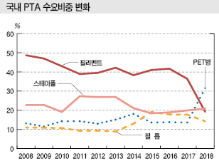 특히, 2018년에는 PTA 수요비중이 PET병 31.6%, 스테이플 20.9%, 필라멘트 19.2%, 필름 14.3%로 PET병 쏠림현상이 심화됨으로써 지속가능한 영업이 불가능한 것으로 판단되고 있다.