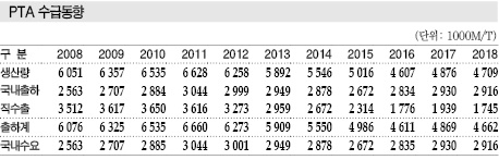 국내 PTA 생산량은 2012년까지 600만톤 이상을 유지했으나 중국이 자급률을 높인 2014년부터 500만톤대, 2016년부터는 400만톤대로 줄어들었고 수출도 2012년까지는 300만톤을 상회했으나 2013년부터 200만톤대, 2016년부터는 100만톤대 후반으로 쪼그라든 것으로 파악되고 있다.