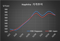 나프타(Naphtha)는 하락세로 전환됐다. 나프타 시세는 12월20일 C&F Japan 톤당 569달러로 7달러 하락했고 FOB Singapore은 570달러로 13달러 급락했다. CIF NWE는 542달러로 10달러, FOB USG는 521달러로 9달러 상승했다. 표, 그래프: <Naphtha 가격추이> <화학저널 2019/12/27> |
